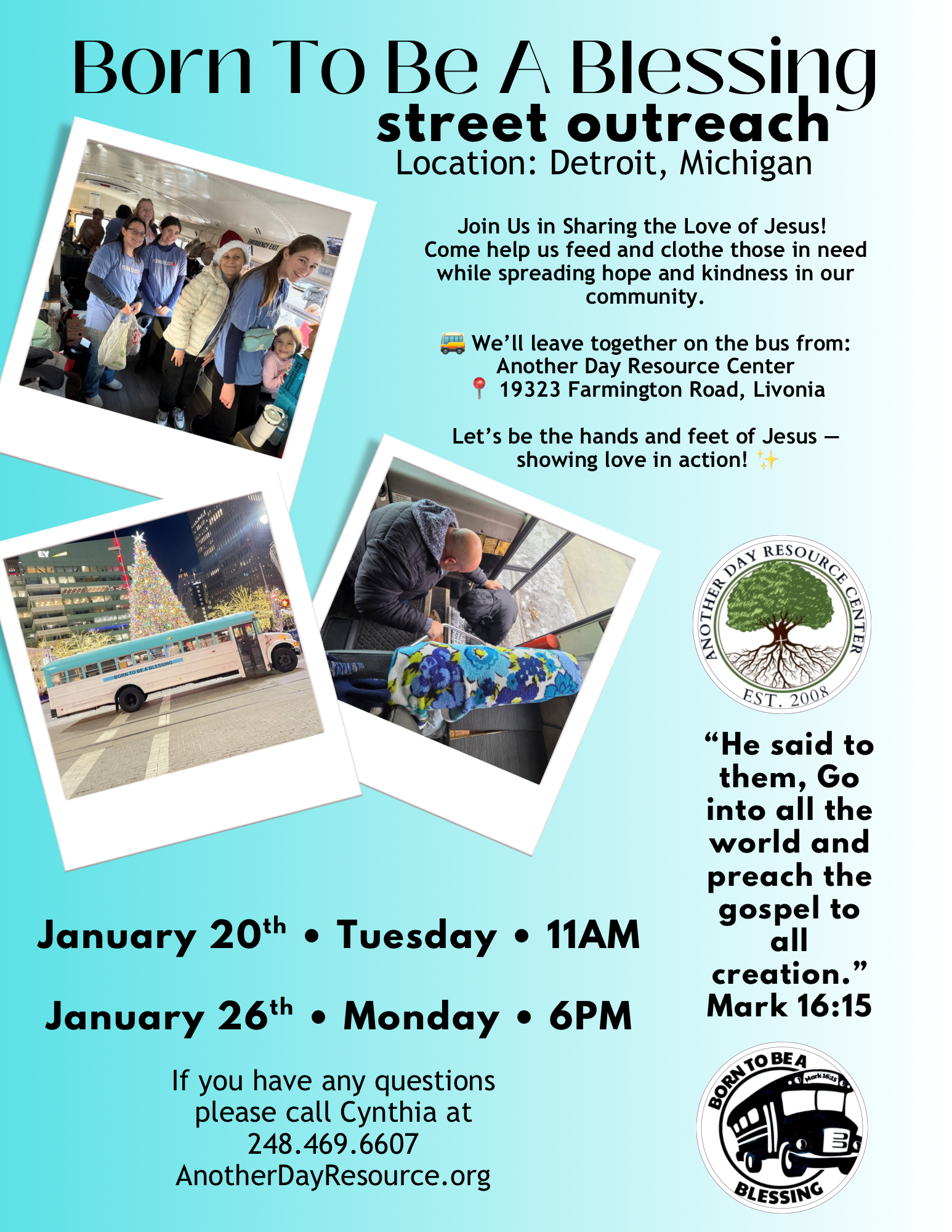 Born to be a Blessing is a boots-on-the-ground outreach that goes into the streets to serve others in the Detroit area and also surrounding communities in the suburbs several times a month to distribute clothing, lunches, hygiene kits, Bibles, prayer and encouragement to those in need.